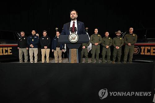 ICE vehicles sit in the background as federal immigration agents listen to US Vice President JD Vance speak at an industrial shipping facility on the administration's economic agenda and impacts on the Midwest in Toledo, Ohio, on Thursday, Jan. 22, 2026. (Jim Watson/Pool Photo via AP) POOL PHOTO