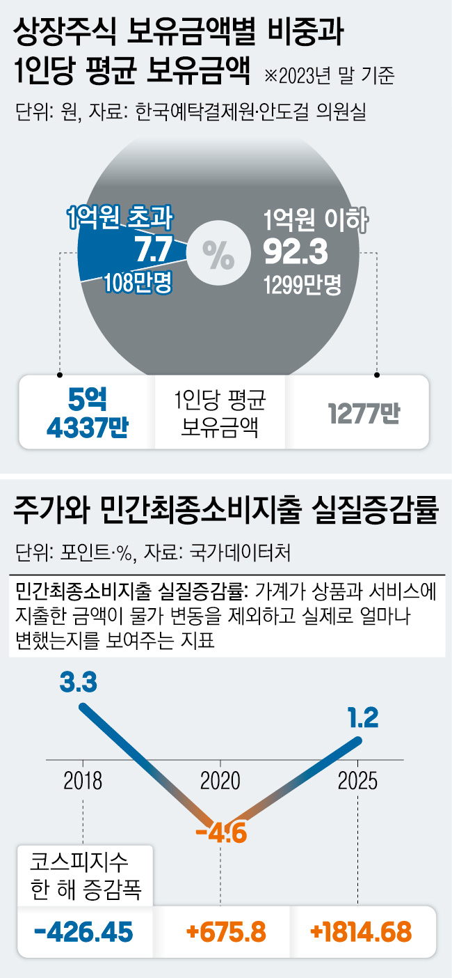 특히 국내 ‘주식 부자’가 극소수에 그친다는 점도 고려해야 한다. 안도걸 더불어민주당 의원이 공개한 한국예탁결제원 자료를 보면 2023년 말 기준 국내 상장주식 1억원 이하 보유자는 전체 투자자의 92.3%(1299만명)로 절대 다수를 차지했지만 보유액 비중은 전체 금액의 22%에 그쳤다. 나머지 7.7%의 상위 투자자가 전체 보유액의 78%를 보유하고 있었다. 1억원 이하 보유자의 1인당 평균 보유액은 1277만원, 1억원 초과 보유자는 5억4337만원이었다. 주가가 오르더라도 전체 소비로 확산되기 어려운 구조다.