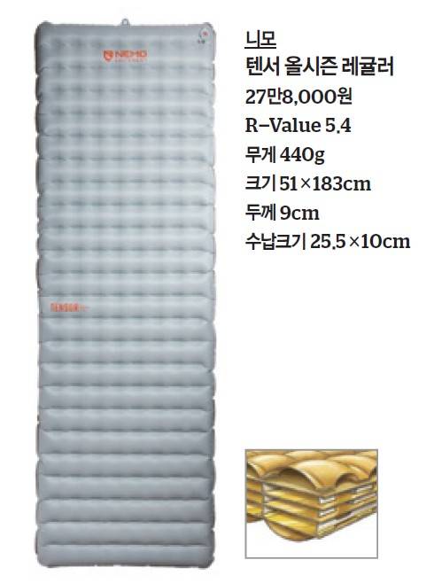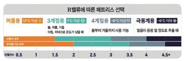 일반적으로 겨울을 포함한 4계절용은 R밸류 3.0 이상, 극동계용은 4.0 이상을 사용하면 된다. 출처 씨투써밋.