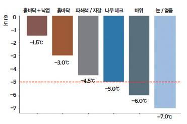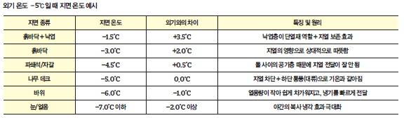백패킹에서 중요한 건 '공기 온도'가 아니라 지면에서 올라오는 냉기다. 지면의 종류에 따라 실제 지면 온도가 달라진다. 같은 날이라도 야영하게 될 장소에 따라 단열 장비를 다르게 준비해야 하는 이유다. 지면 종류별 온도차이를 살펴보자.
