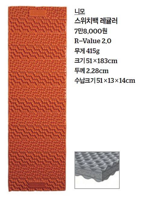 최근 백패킹에서 가장 많이 사용하는 매트로 부피가 작고 무게가 가벼우면서도 단열 성능이 뛰어나 효용성이 좋다.