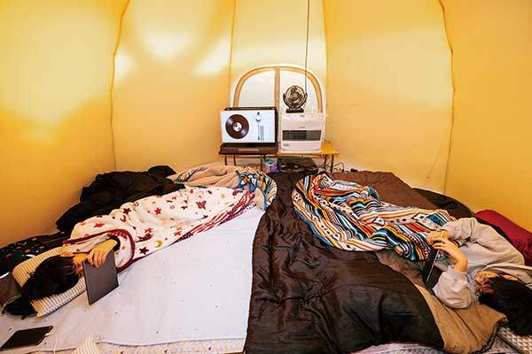 · 단열을 넘어 직접적으로 열을 공급하는 난방 기구-자충 매트 위에 전기장판을 깔면 바닥 난방 효과를 낼 수 있다. 침낭 속에 들어가 웅크리지 않아도 이불만 덮고 잘 수 있을 정도록 아늑한 환경을 만들어 낸다.