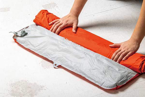 4. 펌프 색에 공기가 가득 차면 입구를 막고 돌돌 말면서 매트 안으로 바람을 넣는다.