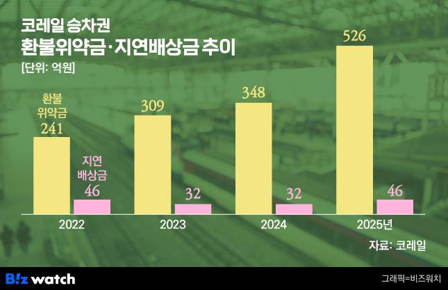 실제 코레일의 위약금 수입은 2024년 348억원에서 작년 526억원으로 크게 증가했다. 그러나 이를 전부 고객 서비스에 재투자하는 것은 아니다. 정정래 직무대행도 "임산부 할인, 장애인·다자녀 좌석 우선 배정 등 공공 서비스에 많이 재투자하고 있다"면서도 "500억이 전부 그쪽으로 들어가진 않는다"고 털어놨다.