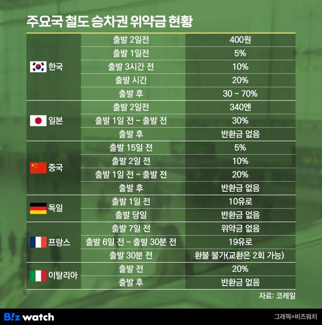 특히 한국의 위약금은 해외 주요국과 비교해도 낮은 수준이라고 코레일은 설명했다. 대표적으로 일본과, 중국, 독일, 프랑스, 이탈리아는 출발 이후 반환금이 없는데 한국만 도착 시간 전까진 요금의 일부를 돌려주는 제도가 있다.