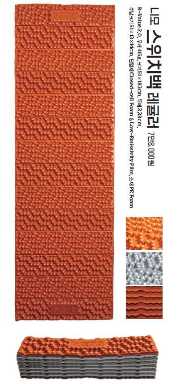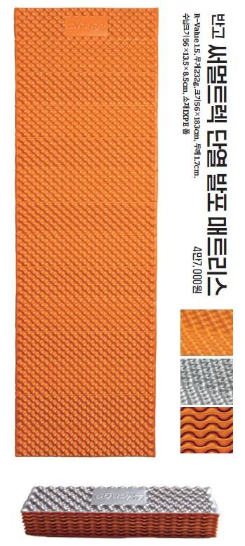 56㎝의 넉넉한 너비의 발포 매트. 열 반사 알루미늄 베이스 실버 코팅으로 보온 성능을 강화했다. 부드럽고 충격 흡수가 뛰어난 폼 디자인으로 내구성을 높였다. 겨울에는 열 반사 코팅면이 위로 오도록, 더울 때는 컬러면이 위로 오도록 하여 기온에 따라 양면으로 사용 가능하다. 250g이 되지 않는 초경량 매트라는 장점이 있지만 두께가 얇고 탄성이 부족해 쿠션감이 아쉽다.