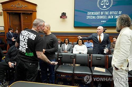 Former Washington Metropolitan Police Department officer Michael Fanone, left, and Ivan Raiklin, second from right, stand up and argue during a recess of testimony of former Justice Department special counsel Jack Smith before the House Judiciary Committee at the Capitol in Washington, Thursday, Jan. 22, 2026. (AP Photo/Mark Schiefelbein)