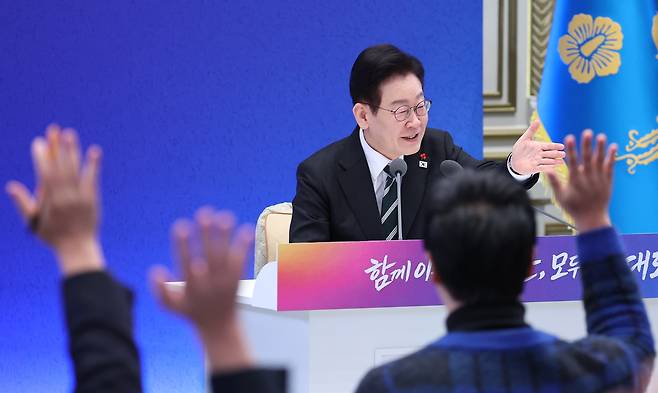 | ▲ 질문 받는 이재명 대통령 이재명 대통령이 21일 청와대 영빈관에서 열린 신년기자회견에서 취재진 질문을 받고 있다. |