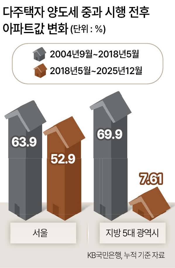 KB부동산에 따르면 다주택자 양도세 중과가 처음 도입된 2018년 5월부터 지난해 12월까지 서울 아파트값은 52.9% 급등했다. 같은 기간 지방 5개 광역시의 상승률인 7.6%를 크게 웃돈다. 규제 도입 이전인 2004년 9월~2018년 5월까지 서울 아파트값과 지방 5대 광역시 아파트 값이 각각 63.9%, 69.9% 상승하며 유사한 흐름을 보였던 것과 대조된다. 다주택자들이 지방 주택을 처분하고 서울의 ‘똘똘한 한 채’로 갈아타면서 결과적으로 양극화가 심화된 것이다.