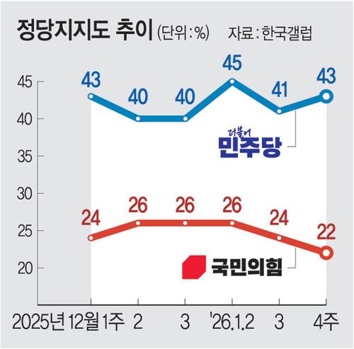 하지만 한국갤럽이 지난 20∼22일 전국 18세 이상 1000명을 대상으로 진행한 1월 4주 조사(95% 신뢰 수준에 표본오차 ±3.1%포인트)에서 국민의힘 지지율은 22%로 조사됐다. 장 대표가 지난해 8월 취임한 후 가장 낮은 수준이다. 민주당은 43%, 조국혁신당은 3%, 개혁신당은 2% 등이다.