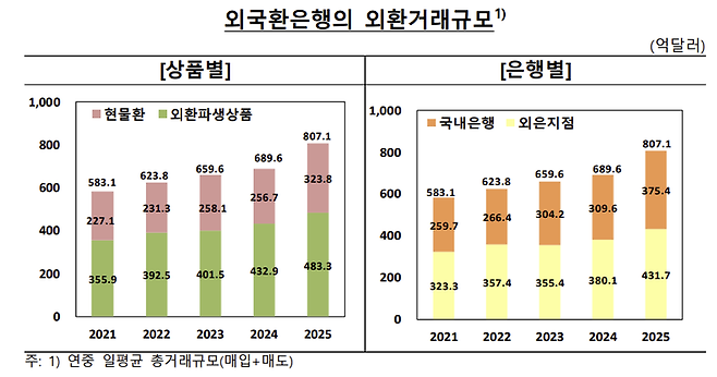 한국은행이 오늘(23일) 발표한 '2025년 중 외국환은행의 외환거래 동향'에 따르면 지난해 외국환은행의 1일 평균 외환거래(현물환·외환 파생상품 거래) 규모는 807억1천만달러로 집계됐습니다.