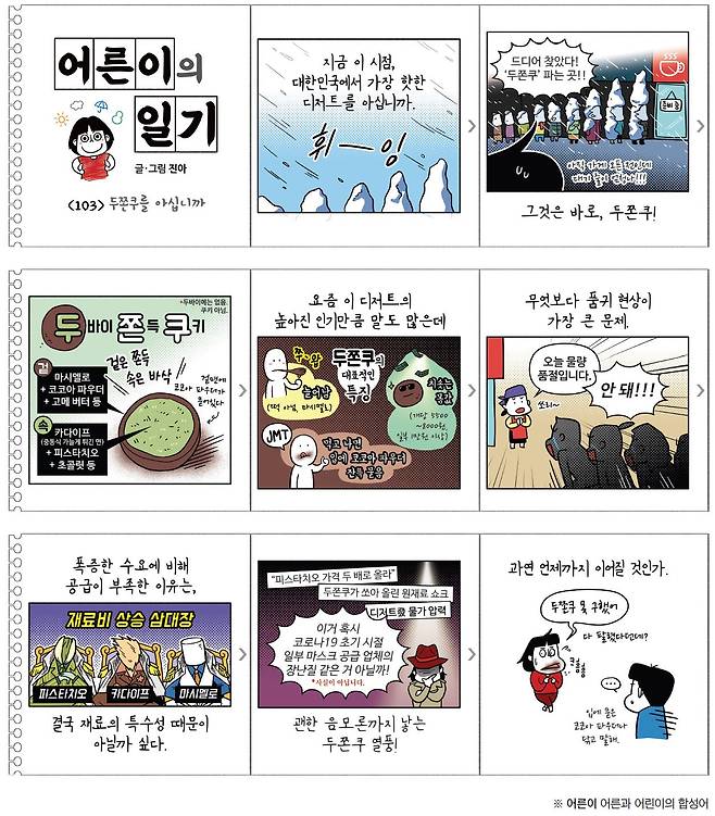 [<103> 두쫀쿠를 아십니까] 어른이의 일기 글·그림=진아 2026. 1. 23. 12:22 음성으로 듣기 음성재생 설정 이동 통신망에서 음성 재생 시 데이터 요금이 발생할 수 있습니다. 글자 수 10,000자 초과 시 일부만 음성으로 제공합니다. 남성 여성 느림 보통 빠름 음성 재생하기 닫기 음성 재생 중지 번역 설정 번역beta Translated by kaka i 한국어 - English 영어 日本語 일본어 简体中文 중국어 Nederlands 네델란드어 Deutsch 독일어 Русский 러시아어 Malaysia 말레이시아어 বাঙ্গোল ভাষা 벵골어 tiếng Việt 베트남어 Español 스페인어 اللغة العربية 아랍어 Italiano 이탈리아어 bahasa Indonesia 인도네시아어 ภาษาไทย 태국어 Türkçe 튀르키에어 Português 포르투갈어 Français 프랑스어 हिन्दी 힌디어 닫기 번역중 Now in translation 글씨크기 조절하기 글자크기 설정 파란원을 좌우로 움직이시면 글자크기가 변경 됩니다. 가 매우 작은 폰트 작은 폰트 보통 폰트 큰 폰트 매우 큰 폰트 가 이 글자크기로 변경됩니다. (예시) 가장 빠른 뉴스가 있고 다양한 정보, 쌍방향 소통이 숨쉬는 다음뉴스를 만나보세요. 다음뉴스는 국내외 주요이슈와 실시간 속보, 문화생활 및 다양한 분야의 뉴스를 입체적으로 전달하고 있습니다. 닫기 인쇄하기 Copyright © 이코노미조선. 무단전재 및 재배포 금지. 이코노미조선에서 직접 확인하세요. 해당 언론사로 이동합니다. "과학은 '무지'의 비즈니스… AI가 미지를 대신 탐험 못 해" "19년 묶인 교부세율 5%포인트 올려야, 진짜 지방 시대" '견제와 균형' vs '정책 엇박자'… 시험대 오른 위기 대응력 2시간 28분 베네수엘라 침공 시나리오… 중·러 제공 방공망 무력화 이온, 日 유통 시총 1위… M&A로 세븐앤드아이홀딩스 제쳐 ‘개천용’ 남아 있지만, ‘유리 바닥’ 단단해지고 있다 "해고 쓰나미 온다, 치열해진 미래… AI 동료 손잡고 인간 동지 응원하라" 실리콘밸리식 사회주의가 유토피아를 만들 수 있을까