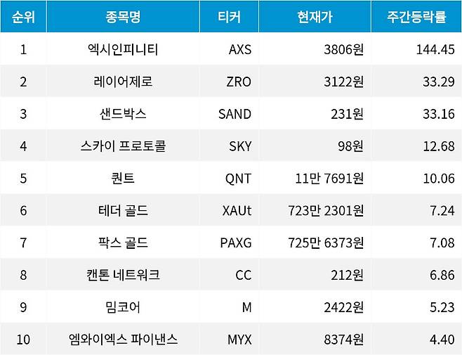 글로벌 가상자산 시황 중계 사이트 코인마켓캡(CoinMarketCap)에 따르면, 1월 16일 7시부터 1월 23일 7시까지 암호화폐 시장에서 엑시인피니티(AXS)가 주간 상승률 144.45%로 1위를 차지했다. 엑시인피니티의 현재가는 3806원이며, 시가총액은 6403억 9479만 원에 달한다. 엑시인피니티는 이더리움 및 론인(Ronin) 네트워크 기반의 P2E 게임으로, ‘SLP 보상 중단’과 계정 귀속형 보상 토큰(bAXS) 도입을 포함한 대규모 토크노믹스 개편과 MMORPG ‘Atia’s Legacy’ 베타 준비 등으로 게임 내 경제 구조를 재설계한다는 점이 특징이다.