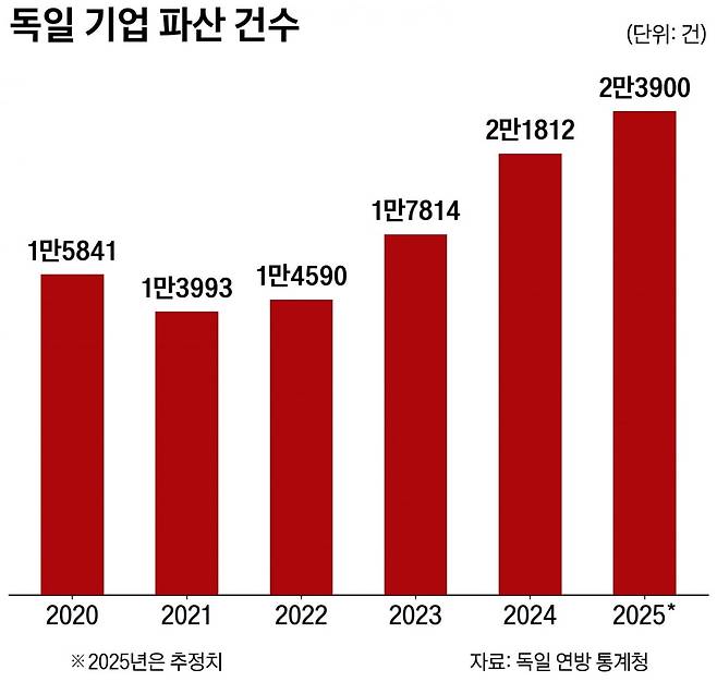독일연방통계청에 따르면 2021년 1만3993건이던 독일 내 기업 파산 건수는 2024년 2만1812건으로 56% 증가했다. 독일 신용평가 기관 크레디트리폼은 지난해 파산 건수가 2만3900건 수준으로 늘었을 것으로 추정했다. 기업 파산의 여파로 지난해 독일의 실업자 수는 294만8000여명, 실업률은 6.3%로 2013년 이후 최고치를 기록했다.