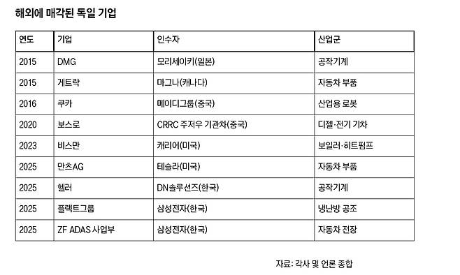 2016년엔 세계 2위 산업 로봇 업체 쿠카(KUKA)가 중국 메이디그룹에, 플라스틱 가공용 기계 분야 세계 최고 기업이던 크라우스마파이가 중국화공그룹(CNCC)에 매각됐다. 이후 게트락(변속기), 보스로(디젤·전기 기관차), 오스람(조명), 비스만(공조)등 굵직한 제조 기업들이 해외로 팔려나갔다.