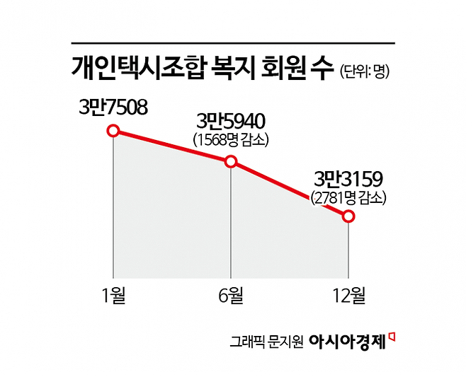 22일 아시아경제 취재를 종합하면 서울개인택시 복지회의 회원 수는 지난해 1월 3만7508명에서 12월 3만3159명으로 4000명 이상 줄었다. 매달 퇴직하는 기사와 복지회를 탈회하는 기사가 겹친 결과다.