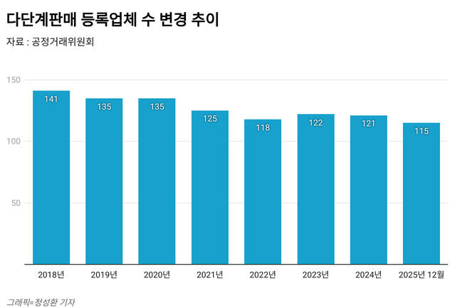 23일 공정거래위원회에 따르면 지난해 말 기준 다단계판매 등록업체는 115개로 집계됐다. 이는 2013년 이후 연말 기준 최저치다. 2025년 3분기와 비교해도 1개 줄었다.
