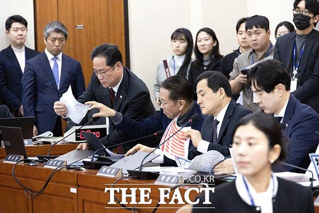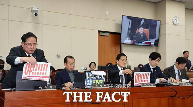 [더팩트ㅣ국회=남용희 기자] 23일 오후 서울 여의도 국회에서 열린 재정경제기획위원회의 이혜훈 기획예산처 장관 후보자 인사청문회에서 국민의힘 의원들이 자리에 피켓을 붙여 놓고 있다.