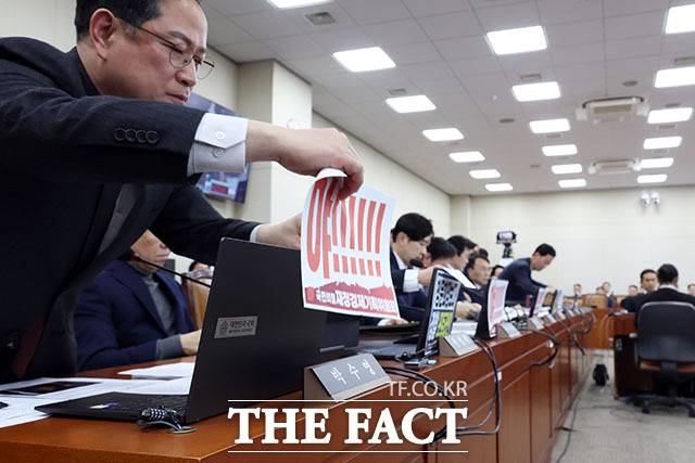 이날 청문회에서 국민의힘 의원들은 '야!!!!!!'가 적힌 손피켓을 노트북 뒷면에 부착했다.
