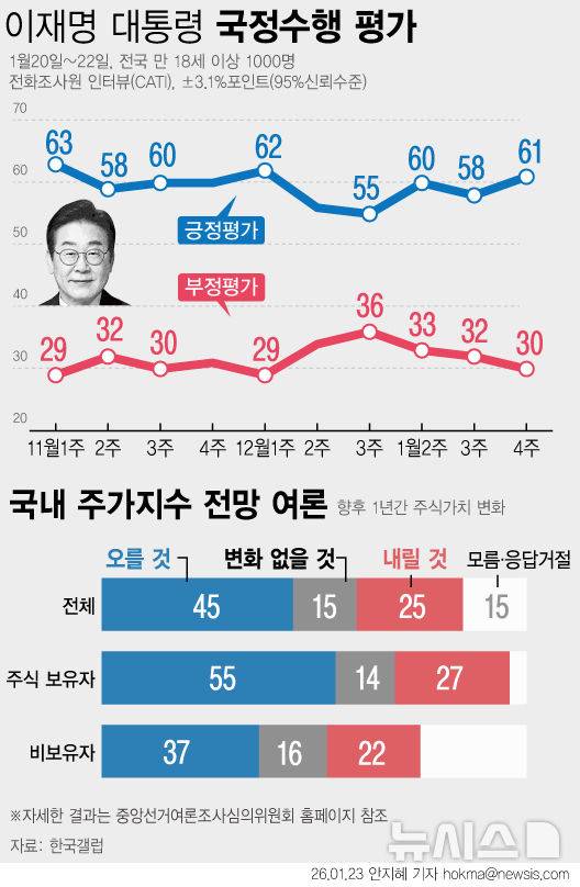 [서울=뉴시스] 한국갤럽이 1월 셋째 주 이재명 대통령의 국정수행평가를 조사한 결과 긍정 평가는 61%로 지난주보다 3%포인트 상승했다. 부정 평가는 30%로 직전 조사 대비 2%포인트 하락했다. 한편 향후 1년간 국내 주가지수에 대한 전망을 물은 결과 상승할 것이라는 응답은 45%로, 하락 전망(25%)을 크게 웃돌았다. (그래픽=안지혜 기자)