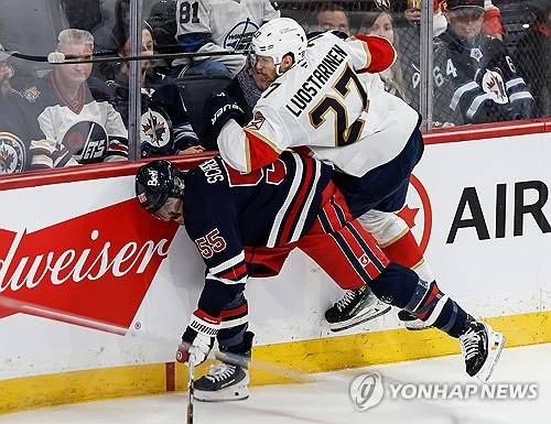 Winnipeg Jets' Mark Scheifele (55) and Florida Panthers' Eetu Luostarinen (27) collide during third period NHL action in Winnipeg, Manitoba, Thursday, Jan. 22, 2026. (John Woods/The Canadian Press via AP) MANDATORY CREDIT
