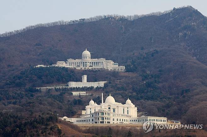 (가평=연합뉴스) 임화영 기자 = 정교유착 비리 의혹을 수사하는 검·경 합동수사본부가 통일교의 '쪼개기 후원' 의혹과 관련해 23일 압수수색이 진행 중인 경기도 가평군 통일교 천정궁. 2026.1.23