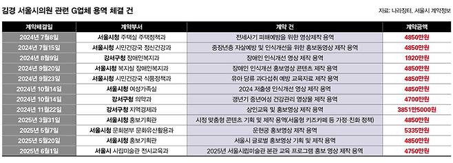 의혹은 이뿐만이 아니다. G업체는 서울시와 처음 수의계약한 이후부터 김경 서울시의원의 상임위원회 활동과 연관된 용역 사업을 잇따라 따냈다. 계약 상대는 모두 서울시와 시 산하기관, 그리고 강선우 의원과 김 시의원의 지역구가 있는 강서구청이었다. 이렇게 업체가 2024~25년 맺은 계약 금액은 모두 5억4506만5000원으로 집계됐다. 설립한 지 불과 1년6개월 만에 서울시와 강서구 등과의 수의계약 12건만으로 5억원 이상 용역을 단독으로 가져간 것이다(표 참조). 한 업계 관계자는 "여성 기업임을 감안해도 신생 업체가 지자체를 상대로만 5억원이 넘는 계약을 체결한 건 일반적이지는 않다"고 했다.