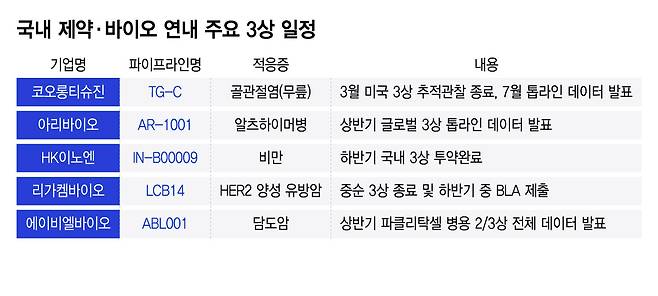 23일 업계에 따르면 에이비엘바이오와 리가켐바이오, 코오롱티슈진, 아리바이오 ,HK이노엔 등은 올해 핵심 파이프라인의 임상 3상 결과를 발표할 예정이다. 3상이 성공할 경우 곧바로 허가 신청에 돌입하는 등 본격적인 상업화 작업에 돌입한다는 목표다.