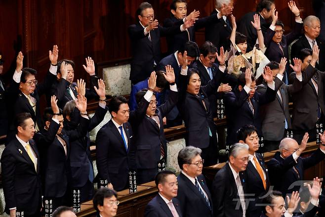 (도쿄 로이터=뉴스1) 최종일 선임기자 = 23일 일본 도쿄 국회에서 중의원(하원) 해산이 선포된 후 의원들이 손을 들어 "반자이(만세)"라고 외치는 가운데, 다카이치 사나에 일본 총리가 고개를 숙여 인사하고 있다. 2026.01.23