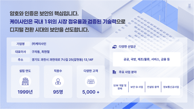 케이사인은 1999년 11월 설립된 정보보안 전문기업이다. 약 100명의 구성원이 데이터 보호와 신뢰 기반 디지털 환경 구축이라는 비전 아래 개인정보 암호화·PKI 인증·통합 인증·모바일 보안·AI 보안 등의 사업을 전개하고 있다. 공공·금융·민간 전반에서 축적한 기술력과 레퍼런스를 바탕으로 국내 대표 보안 기업으로 자리매김해왔다.
