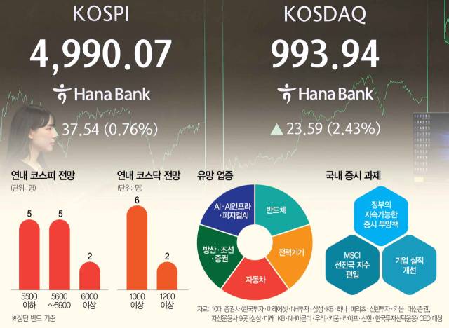 국내 금융투자 업계 최고경영자(CEO)들이 5000 선 고지를 밟은 코스피의 상승 동력을 이어가기 위한 3가지 핵심 과제로 정부의 지속 가능한 증시 부양책과 모건스탠리캐피털인터내셔널(MSCI) 선진국 지수 편입, 기업 실적 개선을 꼽았다. 3차 상법 개정안 등 주주가치 제고를 위한 지속적인 증시 부양책으로 유동 자금을 국내 증시로 끌어모으면서 동시에 MSCI 선진지수 편입으로 신뢰성을 높여 외국인투자가 유입을 늘려야 한다는 조언이다.