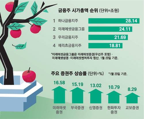 증권주 시가총액 1위인 미래에셋증권은 디지털 자산 법제화에 따른 수혜 기대감까지 더해지며 시총(우선주 포함)이 은행계 우리금융지주까지 넘어섰다.