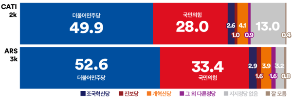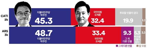 한편 꽃이 서울시민 3009명을 대상으로 같은 기간 실시한 자동응답전화조사(ARS) 결과도 CATI 조사와 큰 차이가 나지 않는다. 역시 민주당 후보들이 국민의힘 후보를 오차범위를 벗어나 큰 차이로 앞서는 것으로 조사됐다.