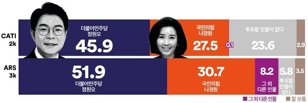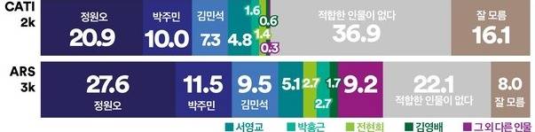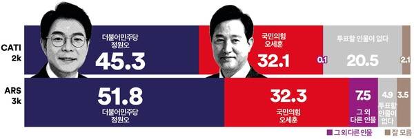 민주당의 서울시장 후보로 급부상한 정원오 성동구청장은 오세훈 서울시장과의 양자대결에서 45.3%의 지지를 얻어 32.1%에 그친 오세훈 시장을 13.2%포인트 차이로 앞선 것으로 집계됐다. 정원오 구청장은 나경원 의원과의 대결에서도 45.9%의 지지를 얻어 나경원(27.5%)을 18.4%포인트 앞섰다. 정 구청장은 ARS 조사에서는 오세훈 시장과 나경원 의원과의 양자 대경에서 모두 과반을 넘겼다.