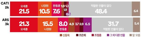 보수후보 적합도 조사에서는 오세훈 서울시장이 21.5%, 나경원 의원 10.5%. 한동훈 전대표 7.6%, 조은희 의원 1.9%, 조정훈 의원 1.3% 등 순이었다. 적합한 인물이 없다거나 모름 무응답은 54.8%나 됐다. 보수후보 적합도 조사에[서 1위를 차지한 오세훈 시장은 민주당 후보들과의 양자 가상대결에서 모두 패하는 것으로 나왔지만 2위인 나경원 의원에 비해서는 후보 경쟁력이 더 있는 것으로 확인됐다.