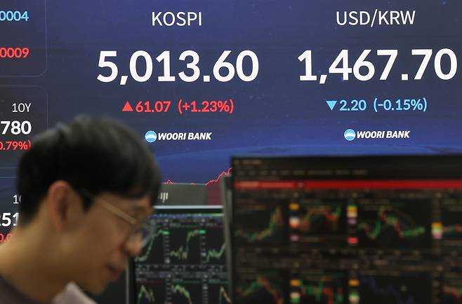 | ▲ 코스피, 장 초반 5000선 회복 23일 오전 서울 중구 우리은행 딜링룸에서 딜러들이 업무를 보고 있다. 이날 코스피는 오전 9시 21분 기준 전장보다 62.72포인트(1.27%) 오른 5,015.25다. |
