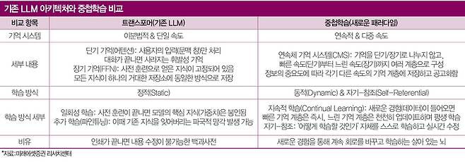 그동안 LLM 경쟁은 ‘성능 싸움’에 치우쳤다. ① 데이터 학습량 ② 긴 문맥 이해 ③ 정확한 답변이 평가 기준으로 작동했다. 하지만 구글은 이 경쟁이 오래가지 못한다고 봤다. ‘지속적 학습 부재’로 표현되는 LLM의 한계 때문이다. 배운 것을 축적 못한다는 의미다. 일종의 기억상실인 셈이다.