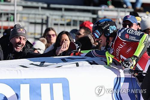 France's Nils Alphand reacts at finish line during a men's World Cup super-G, in Kitzbuehel, Friday, Jan. 23, 2026. (AP Photo/Marco Trovati)