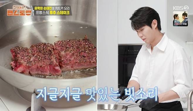 손태진의 첫 번째 요리는 프랑스식 후추 스테이크. 이탈리아에서 만난 프랑스 친구에게 배운 요리라고. 스테인리스 팬을 꺼낸 손태진은 "쓰긴 어려운데, 제가 고기 굽는 덴 자부심이 있다"고 자신감을 드러냈다.
