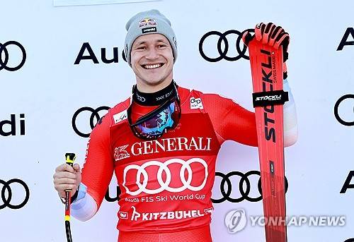 epa12674499 Marco Odermatt of Switzerland smiles on the podium after winning the Men's Super G race at the FIS Alpine Skiing World Cup in Kitzbuehel, Austria, 23 January 2026. EPA/ANNA SZILAGYI
