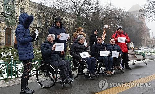 epa12674643 Disabled people in their wheelchairs, assisted by relatives, hold placards as they protest on the sidewalk in front of the government building in Bucharest, Romania, 23 January 2026. The protesters, organized by the Romanian Muscular Dystrophy Association (ADMR), rallied against austerity measures, demanding that the government respect the rights of people with disabilities. One of the complaints is the termination of the rights of those with disabilities to be exempt from vehicle, housing, and land taxes, according to organizers. EPA/ROBERT GHEMENT