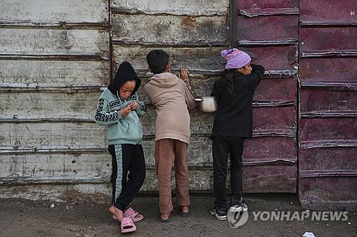 Palestinian children wait to receive donated food at a distribution center in Khan Younis, southern Gaza Strip, Friday, Jan 23, 2026. (AP Photo/Abdel Kareem Hana)