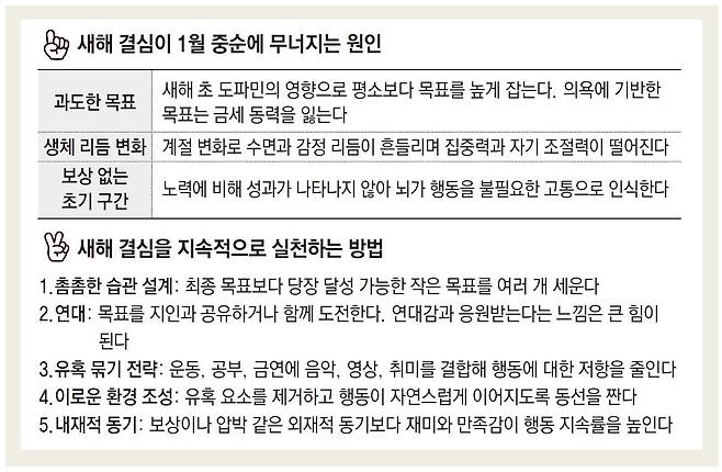 감정에 떠밀린 결심은 금세 동력을 잃는다. 도파민이 잦아들면서 과잉됐던 의욕도 제자리로 돌아오기 때문이다. 전 교수는 “연말연시에 누적된 피로와 긴장감 속에 2∼3주가 지나면 의욕은 평소 수준으로 돌아온다. 현실과 동떨어진 추상적인 목표는 오래 지속되기 힘들다”라고 했다.