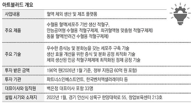 2023년 정부는 복지부·과기부·산업부·식약처·질병청이 참여하는 ‘세포기반 인공혈액 기술개발사업단’을 출범시켰다. 5년간 471억 원을 투입하는 1단계 사업이다. 아트블러드는 사람에게 수혈하는 적혈구 제제를 대량생산하는 핵심 과제를 단독 수주했다. 같은 해 차세대 유망 초기(seed) 기술 실용화 패스트트랙 사업 과제를 수주해 개에게 수혈할 수 있는 적혈구를 세계 최초로 생산하는 데도 성공했다.