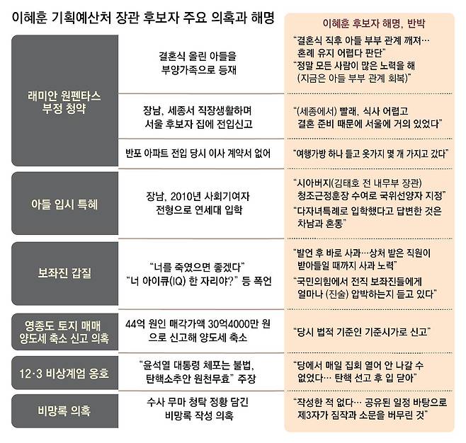 이혜훈 기획예산처 장관 후보자는 23일 국회 인사청문회에서 서울 서초구 래미안 원펜타스 아파트(54평형·전용면적 138m²) 부정 청약 의혹에 대해 이같이 말했다. 하지만 결혼식을 한 장남을 부양가족으로 올려 이른바 ‘로또 아파트’ 청약에 당첨됐다는 의혹과 관련해 장남이 이 후보자와 함께 살았다는 사실을 증명할 자료를 제출해 달라는 요구엔 응하지 않았다. 이 후보자는 “국민들께, 저를 장관 후보자로 지명하신 대통령님께 송구하다”며 고개를 숙였지만 부정 청약 의혹은 물론이고 세금 탈루 의혹, 자녀의 부모 찬스 의혹 등을 부인하면서도 핵심 자료들은 대부분 내지 않았다.