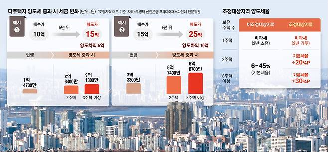 또 다주택자가 6년 전 15억원에 산 주택을 조정지역에서 25억원에 매도할 때(양도차익 10억원), 양도세는 중과 배제 시 3억3300만원이지만 중과 적용 시 2주택자는 5억7400만원(72.4% 증가), 3주택 이상 보유자는 6억8700만원(106% 증가)으로 뛴다.
