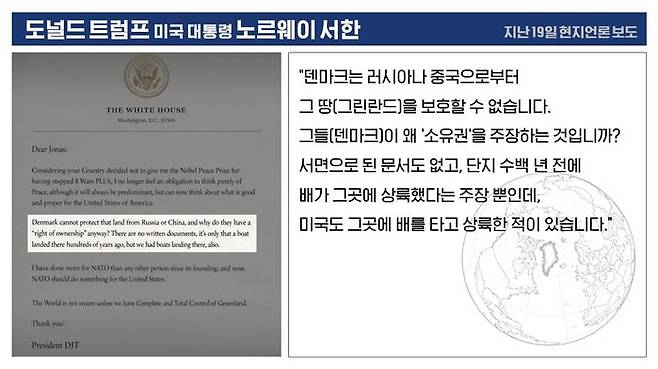 트럼프 대통령이 왜 이렇게 주장하고 있는지는 앞서 노르웨이 총리에게 보낸 서한을 보면 자세히 써 있습니다.