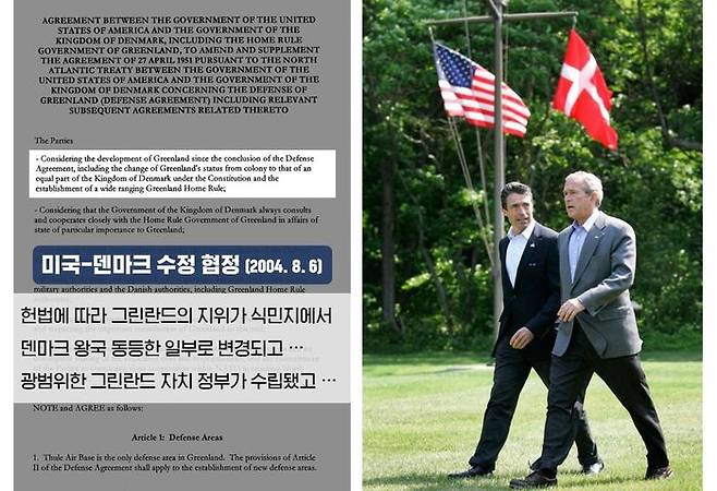 21세기에도 같은 내용의 협정이 있습니다. 2004년 8월, 조지 부시 정부 당시였습니다. 미국과 덴마크는 1951년 협정을 개정했는데, 그린란드의 지위가 '덴마크의 일부'라고 다시 강조했습니다.