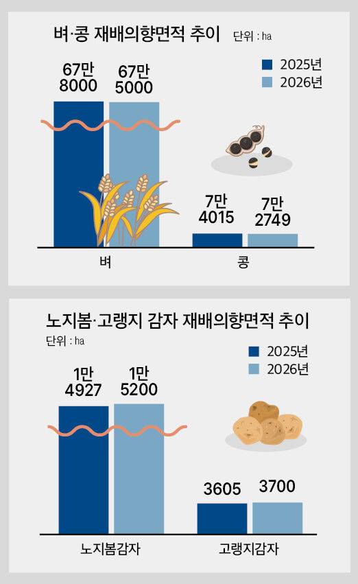 2026년 콩 재배의향면적은 지난해보다 1.7% 감소한 7만2749㏊로 관측됐다. 논콩 재배면적은 쌀값 상승으로 인한 벼 회귀 등으로 지난해보다 소폭 감소하고, 밭콩 재배면적 역시 수익성 악화와 고령화로 감소할 것으로 조사됐다.