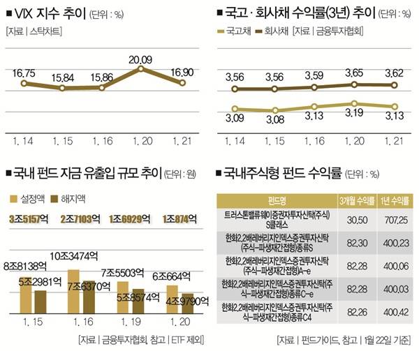 #채권 = 한국은행의 기준금리 동결 이후 채권 금리는 상승세(가격 하락)를 기록 중이다. 금융투자협회에 따르면 국고채(3년물) 금리는 20일 3.19%로 오르며 연중 최고치를 경신했다. 국고채 금리가 3.19%대를 넘어선 것은 2024년 7월 21일(3.21%) 이후 1년 6개월 만이다. 회사채(3년물) 금리도 이날 3.65%를 기록하며 연중 최고치를 경신했다. 한은의 금리 동결 기조에 시장금리가 꿈틀거리고 있다는 얘기다.